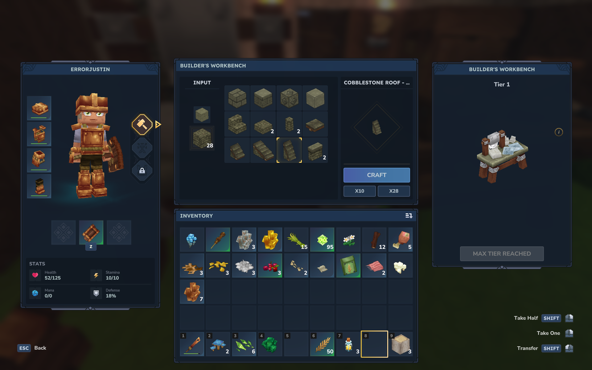Hytale’s crafting system in early access is still very basic (and a little buggy), but coming from Minecraft, I still appreciated some small crafting details like being able to turn raw wood and stone into slanted, tiled roof blocks and half-block-thick walls when building out my starter hut. You can also place shelves on our walls and stick a few decoratives like candles and books on them. By the way – huge fan of how Hytale's crafting benches can see and make use of resources stored in nearby chests.