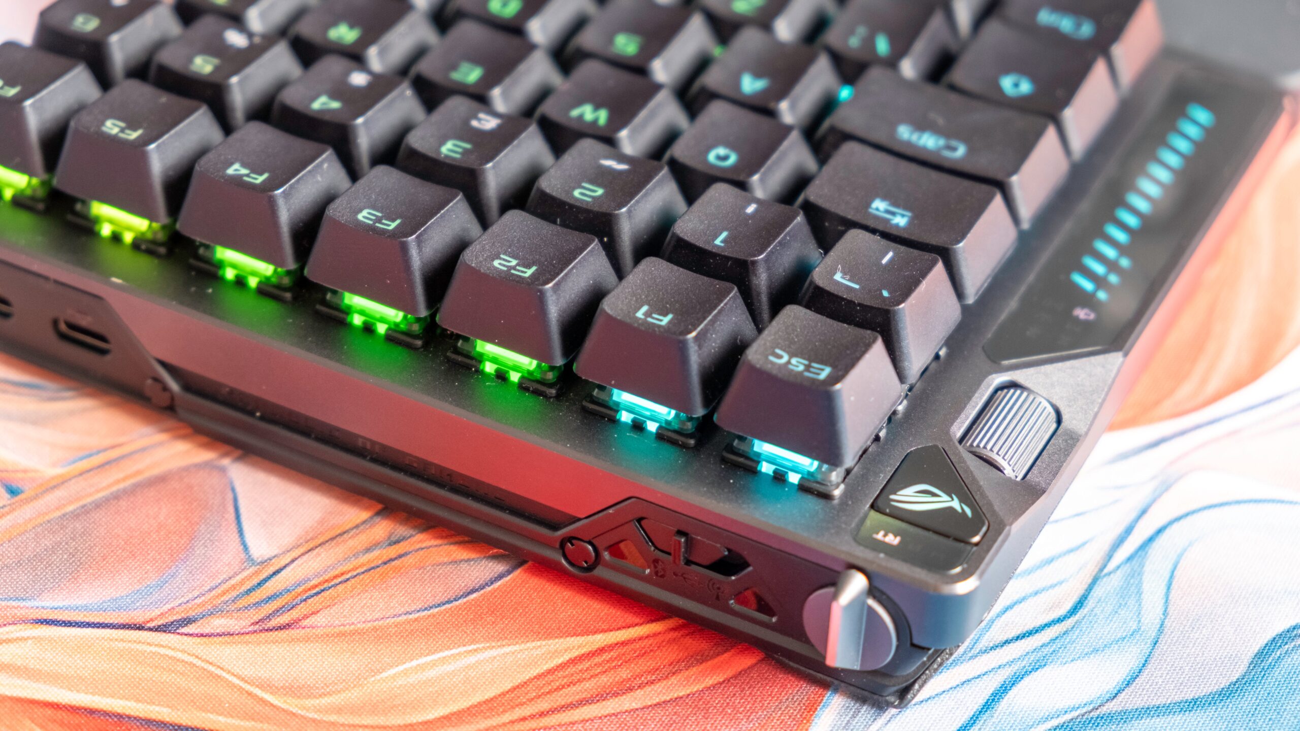 The 75% design is fairly ordinary, with Function row keys along the top, arrow keys in the lower right and a volume wheel in the upper left, though the LED lighting strip along the left side of the board which shows your volume setting and keyboard brightness levels, amongst other metrics, is unique and genuinely useful. Tiny icons illuminate to show you what you're adjusting, and light races up or down the LED strip to signify your current level.