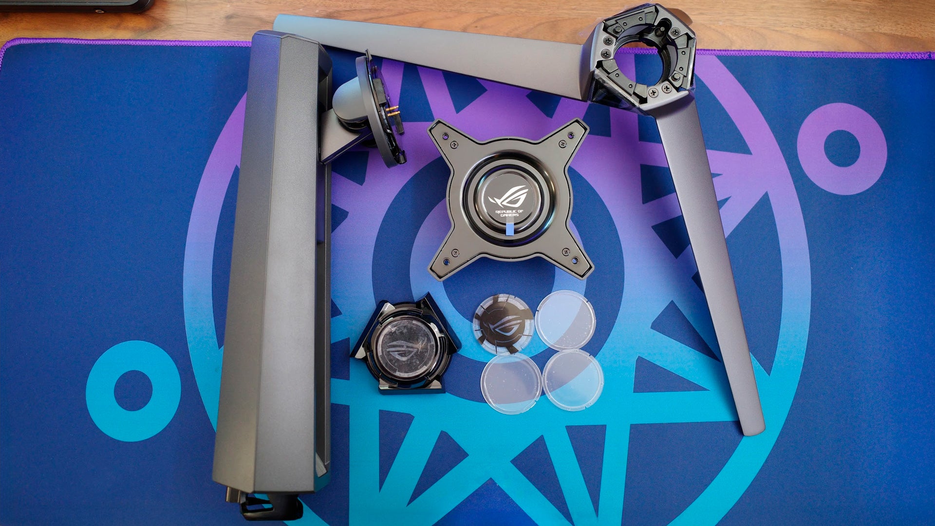 The Asus ROG Swift PG27UCDM is a high-end gaming monitor that both looks and feels the part. It comes well-packaged and includes a number of different accessories, including additional cables in their own zippered bag, decals for the down-firing red illumination of the stand, and even a couple of blank discs to create your own logo. It comes with the same excellent tripod-style stand that comes with other ROG Swift OLEDs and includes a heavy-duty adapter to mount to a third-party arm. The build quality of each piece is excellent, akin to the other ROG Swift monitors we've reviewed so far.