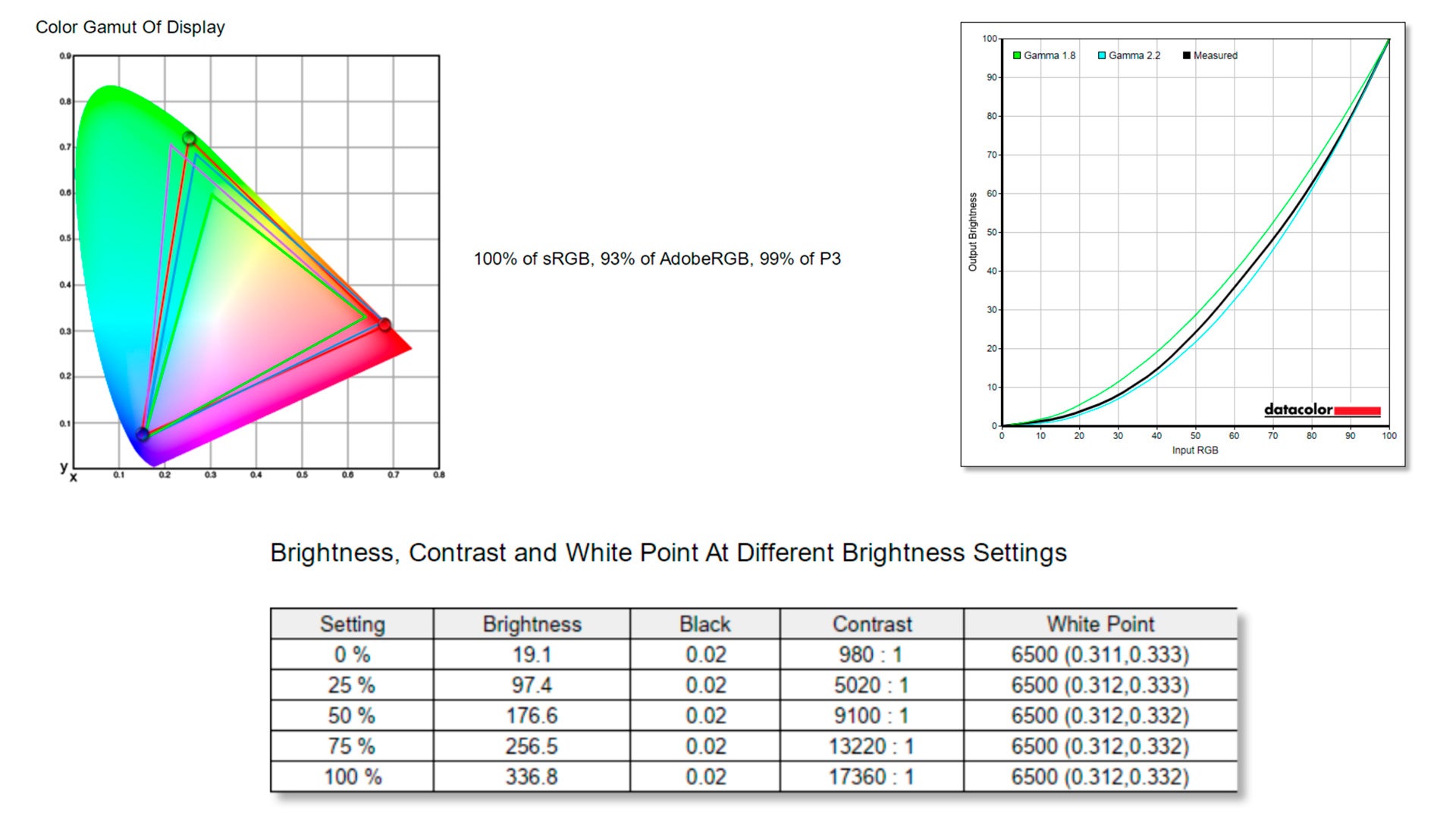 I also verified that Asus’s claims of color gamut coverage were accurate. The display analysis pegged it at 100% of sRGB and 99% of DCI-P3. Properly calibrated, you can be confident that this display is going to be able to represent your work well if you work in a creative field where wide-gamut accuracy is important.