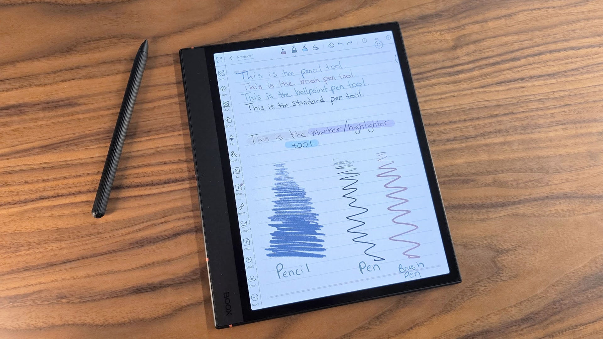 The Note Air 4C excels in writing and note-taking, but there's still room for growth. Like many other e-ink tablets, it offers a palette of writing tools, including pencil, pen, brush pen, ballpoint pen, and marker. Each of these allows you to control the width of the lines and, in the case of the pencil, the texture that you're writing with.