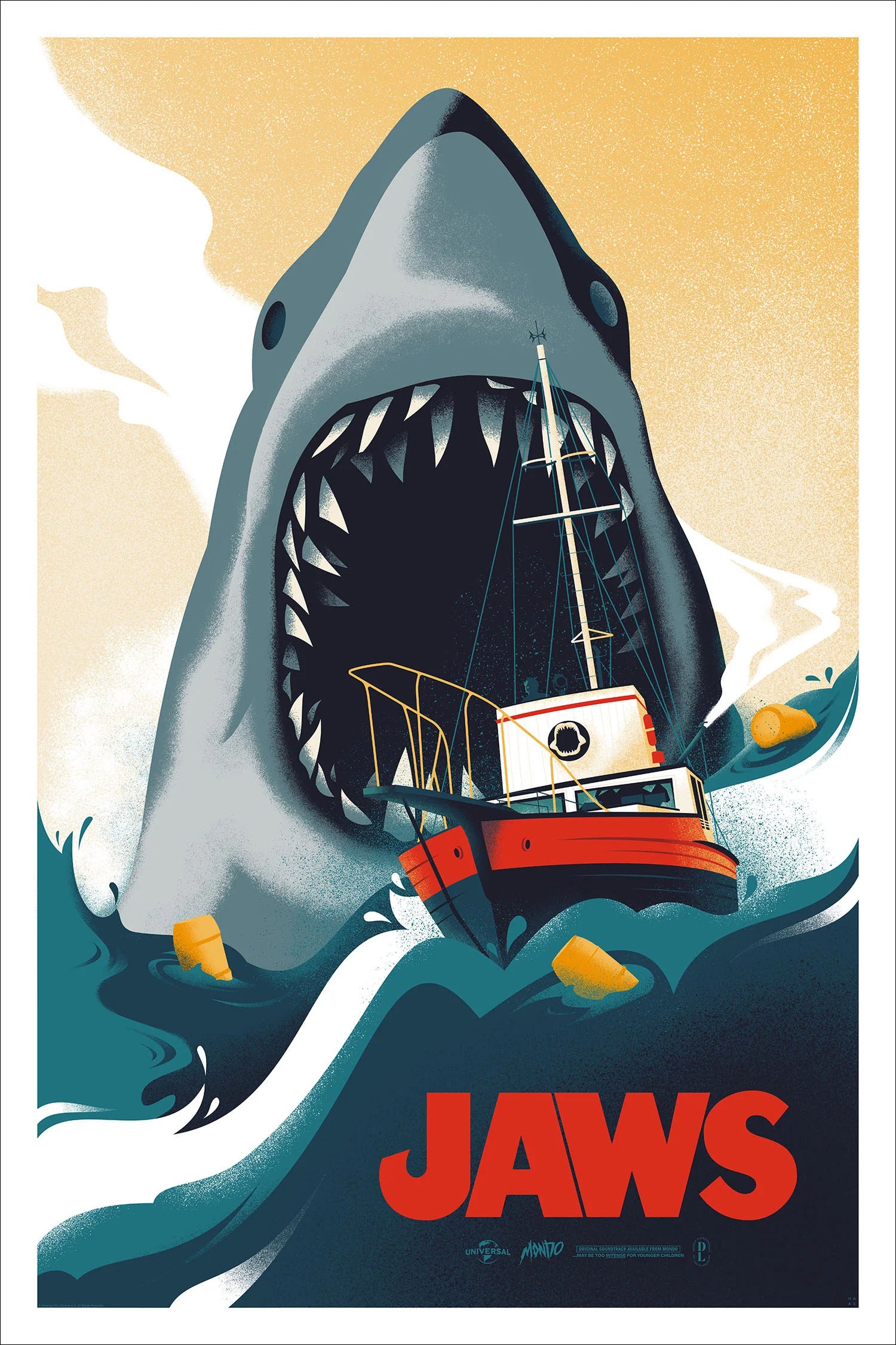 The new Jaws movie poster created its own set of challenges. Put simply, the original Jaws poster painted by Roger Kastel might be the most iconic movie poster ever created. It casts a massive shadow over everything that's come since. And given that Mondo's artists have lent their own takes to Jaws several times already over the years, it's no small task to create a new design worthy of the film's 50th anniversary.