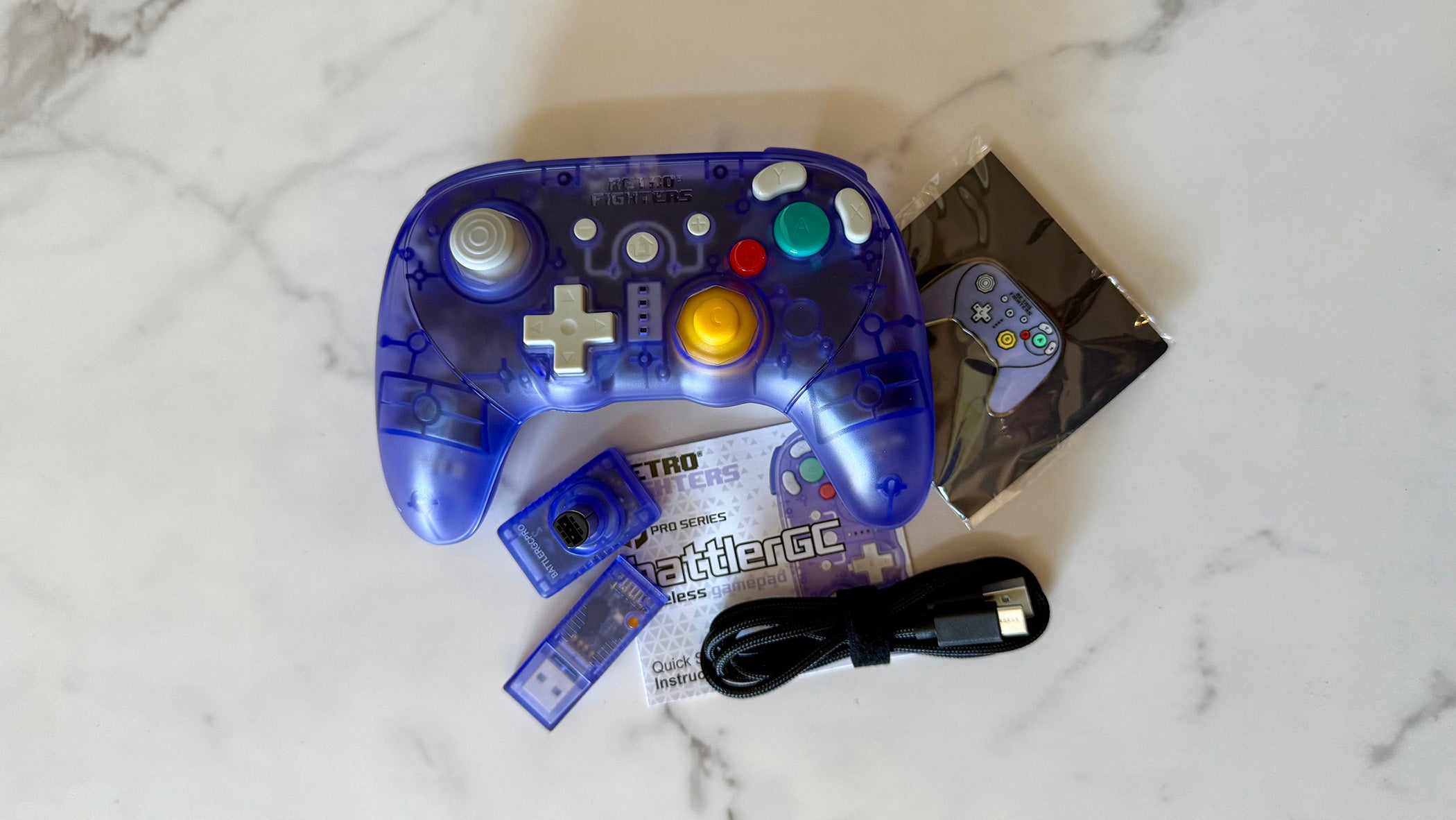 The RetroFighters BattlerGC Pro is available in Purple (Indigo) and Black (Jet Black) colorways to match two of the original GameCube console variations, as well as Glacier, which is like a transparent Purple. In the box is the controller, GameCube controller port wireless dongle, USB-A wireless dongle, 5.8-foot USB-C to USB-A charging and data cable, a Retro Fighters BattlerGC Pro pin, and a Quick Start Instruction Manual. The wireless dongles match the controller.
