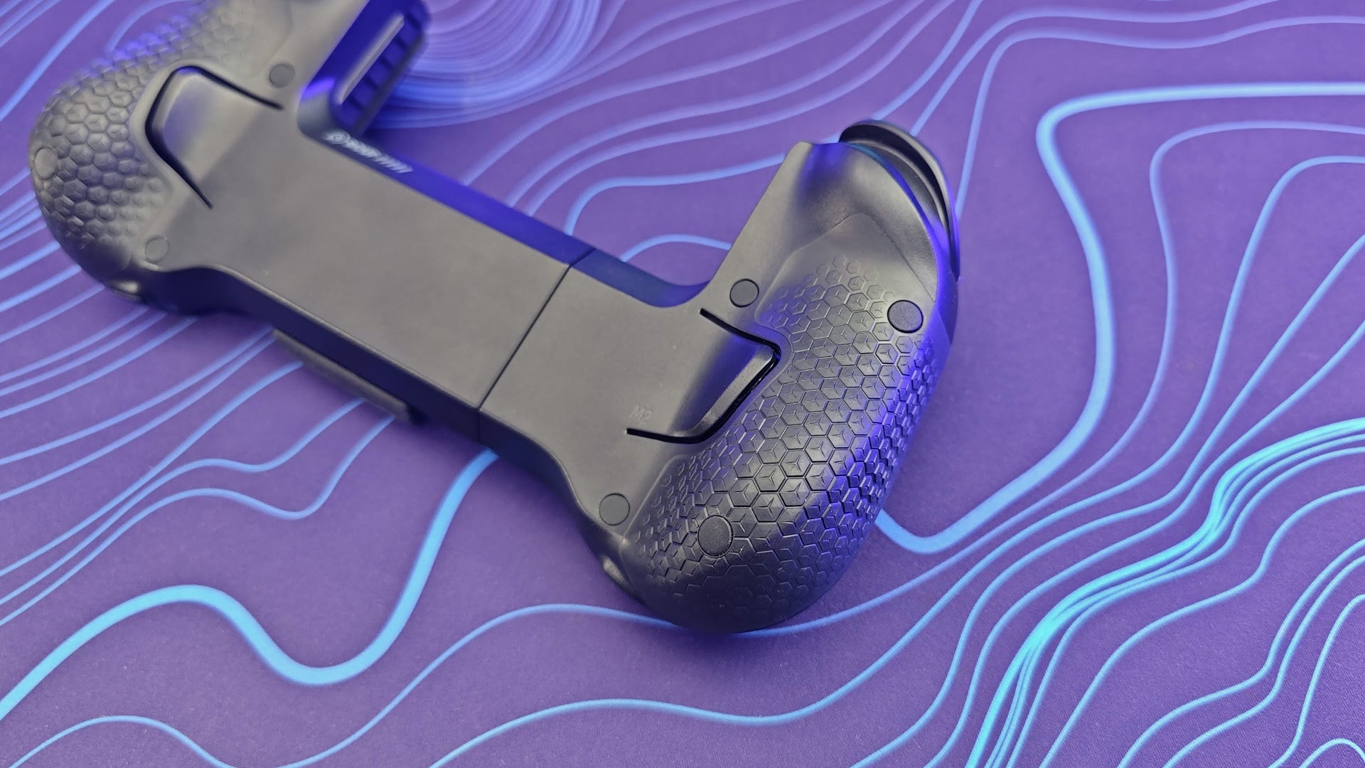 The back of the bracket is trimmed with a digital camo pattern made of Scuf hexagons. The design is made of a crosshatch of diagonal lines running in different directions to reflect the light. It looks like carbon fiber at a glance. There’s also a little rubber bumper that fits on the bottom edge to make sure your camera bump clears the bracket and doesn’t get in the way.