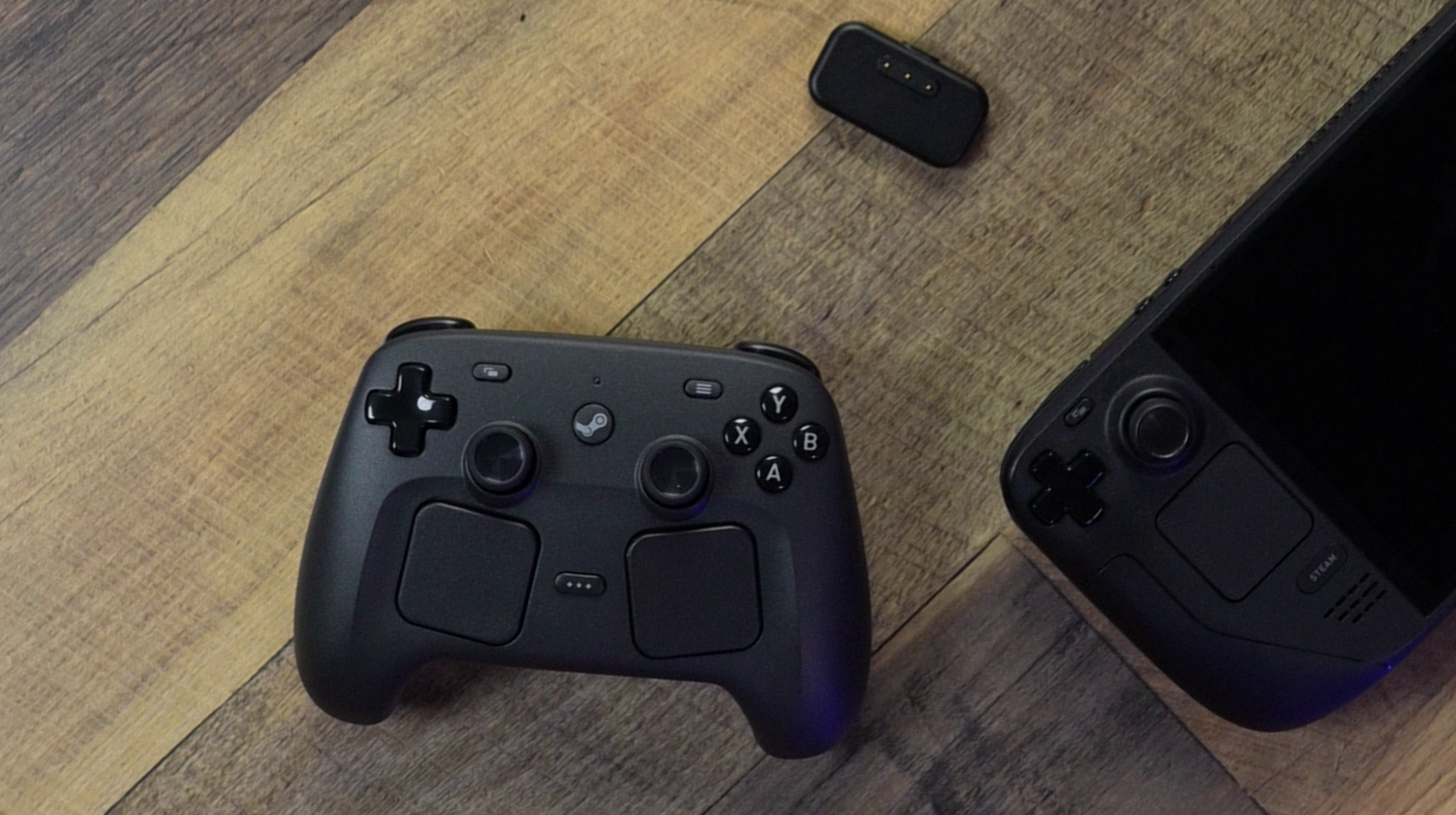 Connectivity is handled by a small puck attached to a 5-foot USB cable, which connects magnetically to the back of the controller. It’s a small detail, but I appreciate the rubber grips on the bottom of the puck, which help keep it anchored on your desk when not in use. Similarly, move the controller nearby and the puck jumps up to attach with a satisfying snap. This made it easy to use the controller “plugged in” when it needed to charge, and the puck’s USB cable is actually a USB-C port that the cable plugs into, which means you can swap it for a longer (or shorter) one if you like. Valve claims a 35 hour battery life, and the ease of connecting to the puck meant I never came close to running dry while testing the controller. In the event you misplace the puck or want to charge or connect without it, there’s also a USB-C port on top of the controller where you’d expect it. You can also connect multiple Steam Controllers to a single puck, if you’re in a multi-controller household.