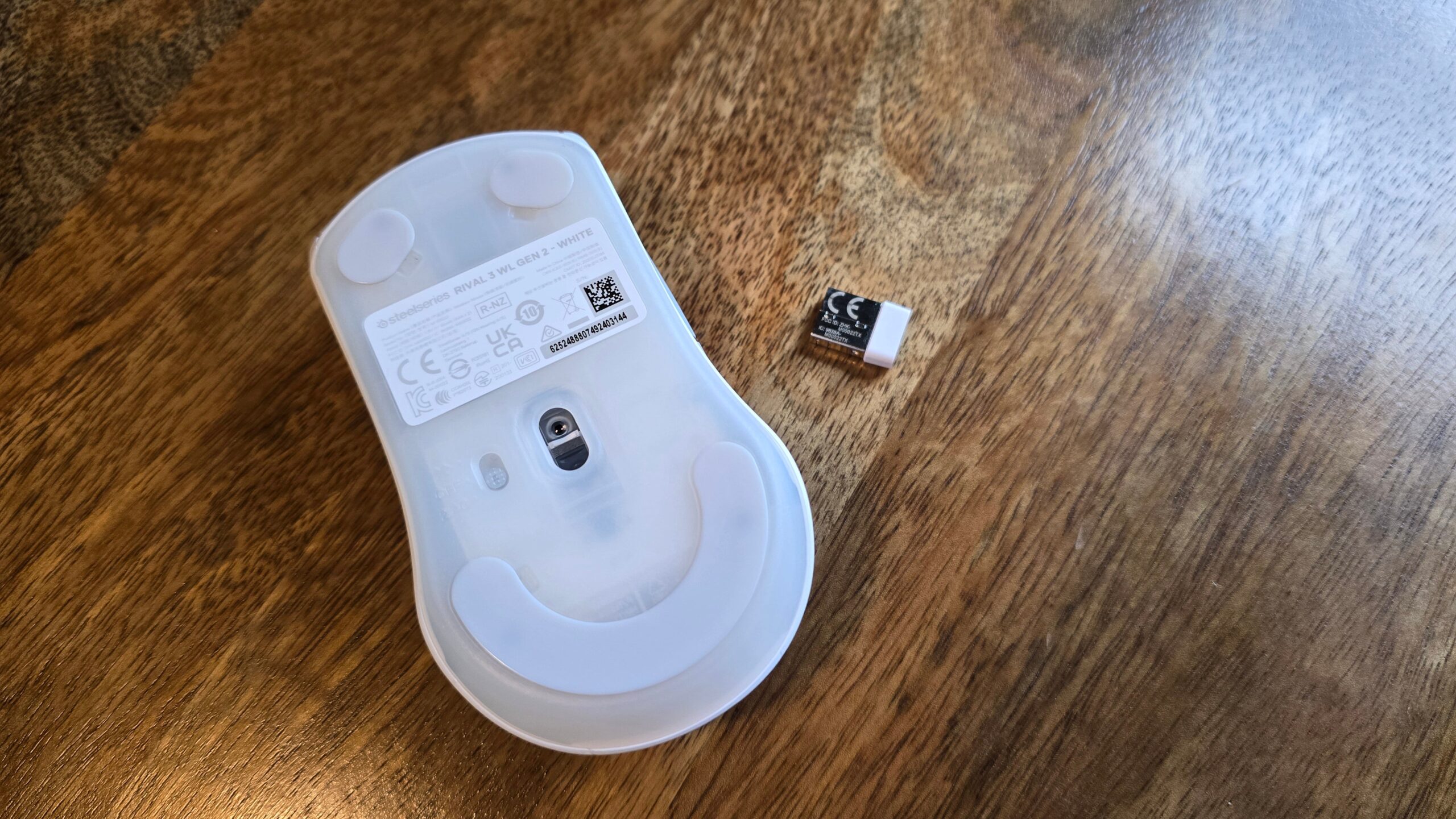 The main body of the mouse slides back to reveal the battery compartment. It requires a decent level of force, making it virtually impossible to open accidentally, and it feels tight and secure when shut. You can also slide the small USB dongle – which enables low-latency 2.4GHz wireless connection – into this compartment, where it sits snugly, and there's a sturdy switch to flick between Bluetooth and 2.4GHz connections.