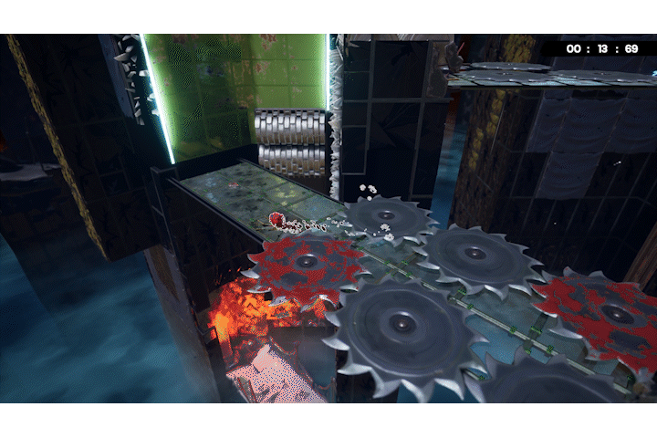 Sluggerfly and Team Meat smartly added a new air dash ability to Meat Boy’s limited repertoire of techniques that allows him to instantly halt his momentum and dash in a direction, which is great because it’s much harder to judge distance in 3D than it is in 2D, and having the ability to instantly correct yourself if you overshot a jump, or quickly latch on to a wall after leaping around a corner is a godsend. Not to mention it makes for great high risk movement tech since you can do a short hop into an airdash for a quick boost of speed that’s faster than just straight up running, which is especially fun when trying to find ways to shave off an extra second or two of your fastest times while going for A+ ranks.