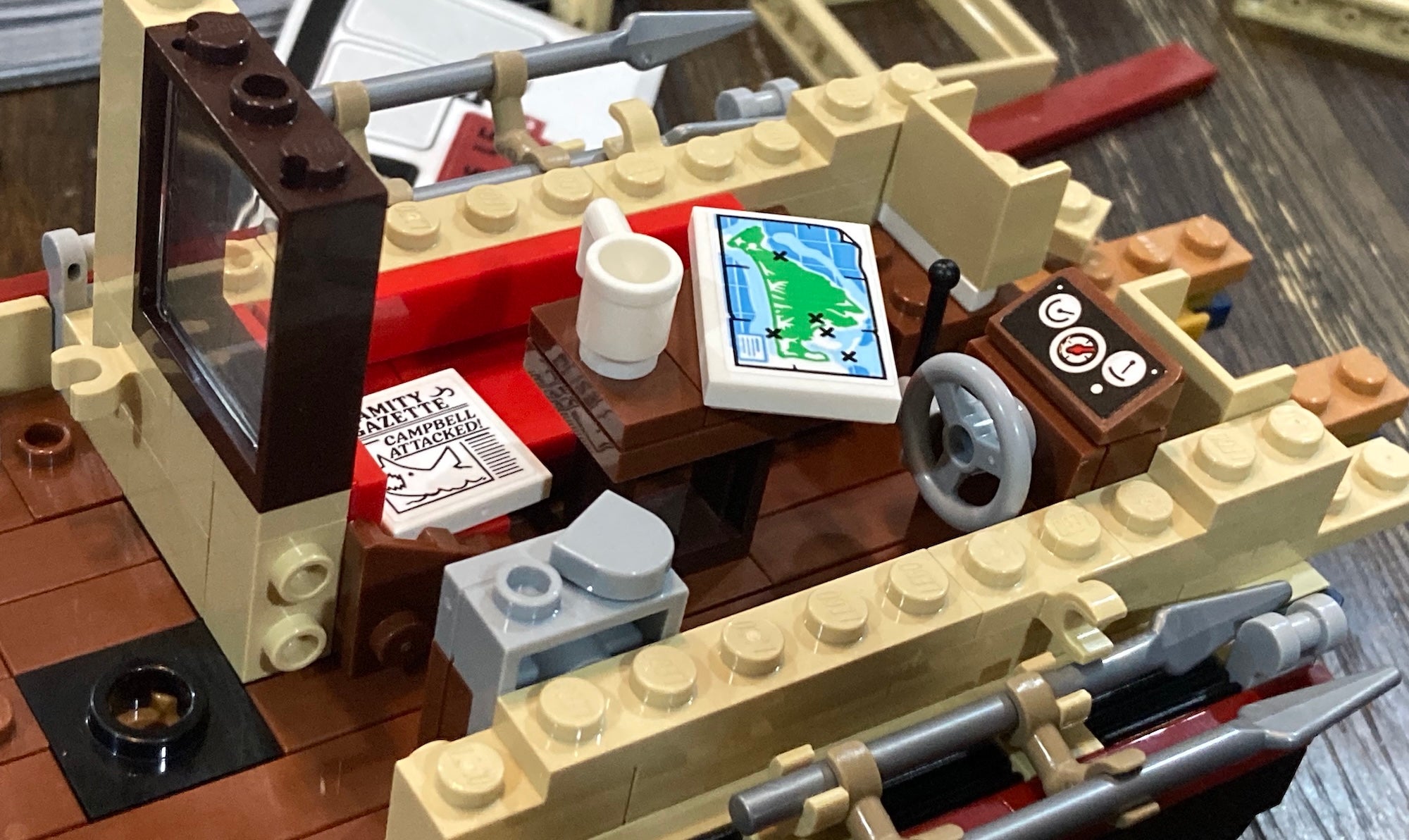 Several details stand out in a build that's full of them. We see Quint's chair mounted on the deck, where he straps himself in before trying to catch the shark. In the ship quarters, we see the Amity Gazette, with a headline that warns about shark attacks. We see a map of the area, to show us where the Orca has yet to explore. We see a set of shark teeth mounted on the wall – evidence of Quint's hard-won experience.