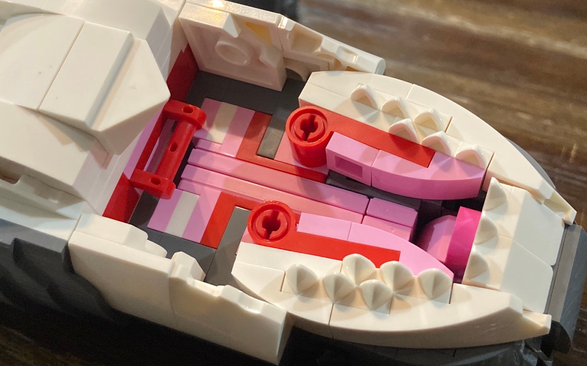Then you build the shark, which is appropriately massive when placed side-by-side with the boat. In LEGO form, the shark is decidedly more cute than menacing; it has small beady eyes and multiple rows of teeth, which you build separately as individual 'dentures' and then insert into the model's mouth, piece by piece.