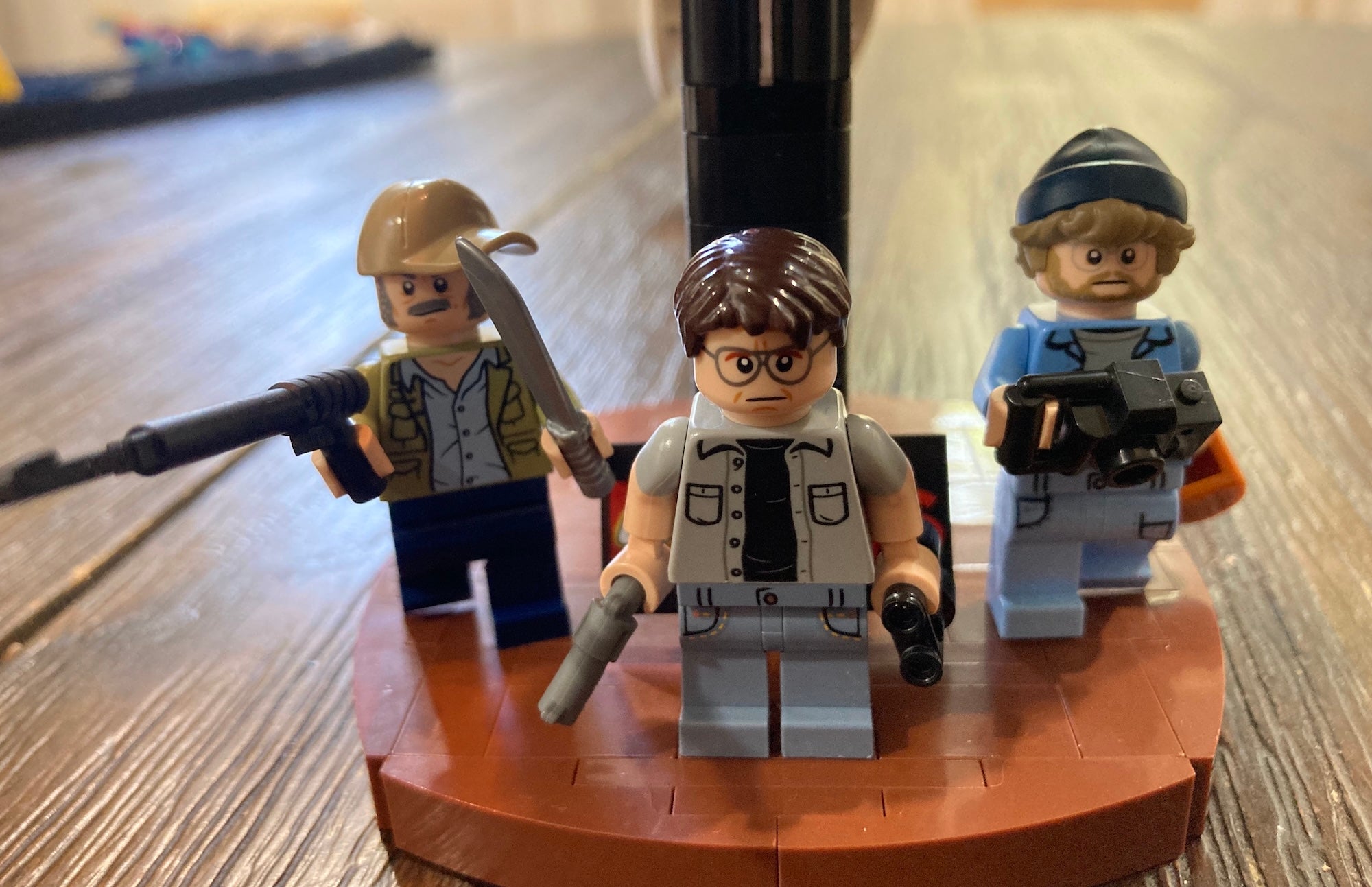 You have two options to display the shark. The first is to display it separately on a mounted, black stand. Beneath it, you can display the three minifigures that come with the set: Sheriff Brody (who comes with a sidearm), Richard Hooper (who comes with binoculars) and Quint (who comes with a speargun).