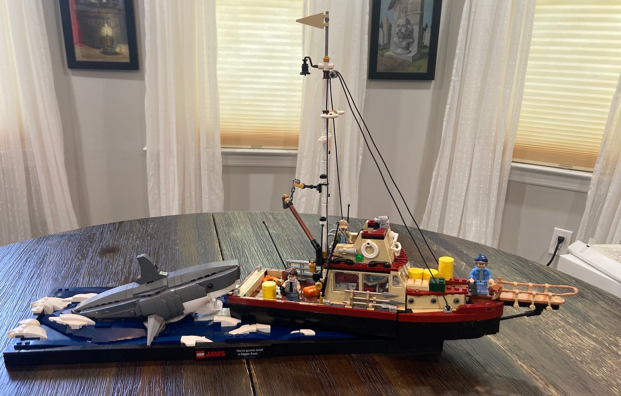 LEGO Jaws depicts the moment after the massive reveal, which Chief Brody commemorates with a deadpanned, iconic understatement: "You're gonna need a bigger boat." The set even has the quote printed on the model's black base, along with the movie's title.