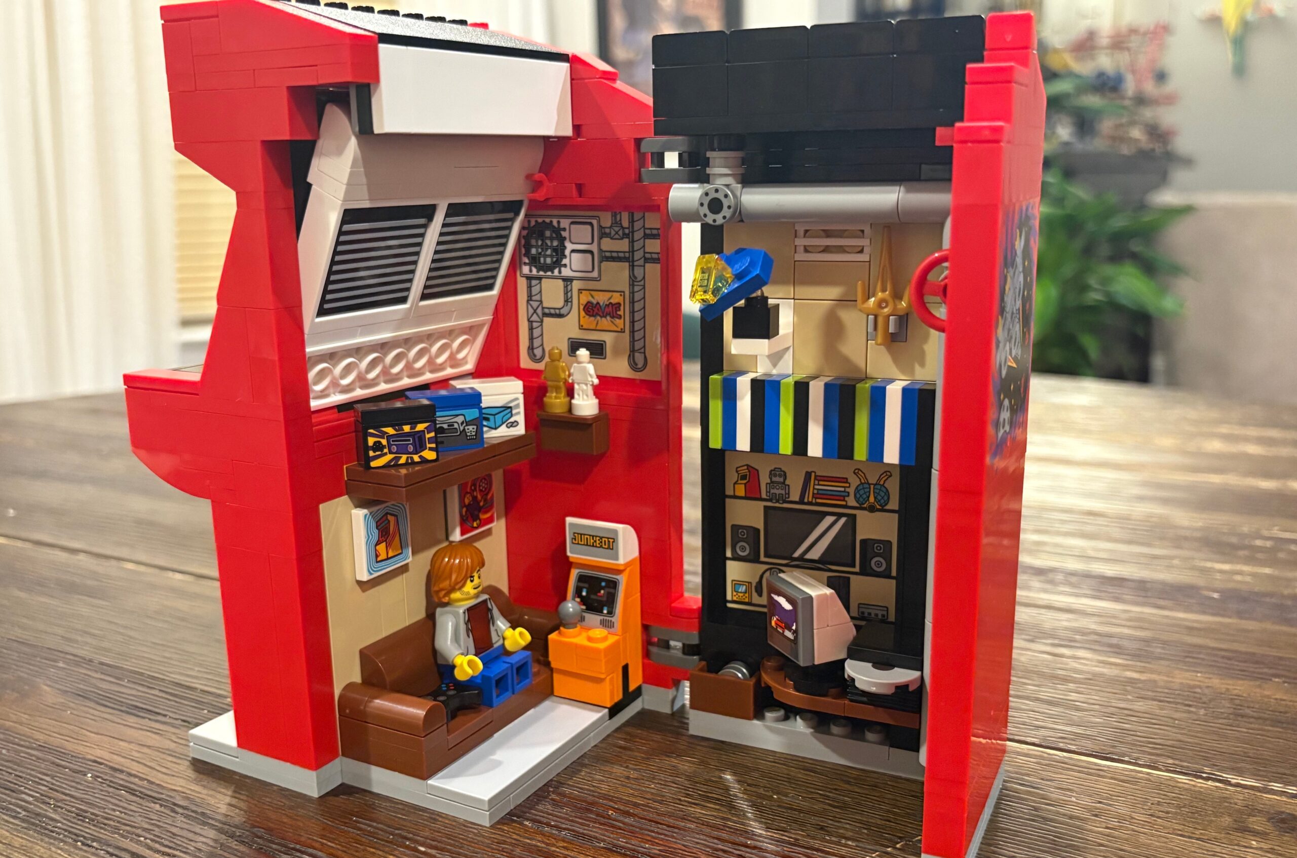 The set's interior is where the LEGO Arcade Machine really shines. The entire cabinet opens on two hinges on the arcade's left side, and inside is an extensive diorama of a gamer's den. There's a brown three-seater couch with a modern game controller on its leftmost cushion. There's an old-fashioned box TV, playing what looks to be an Out Run-inspired racing game. High up on the wall is a model of the classic LEGO Space Galaxy Explorer from 1979 and a sai to represent the LEGO Ninjago franchise.