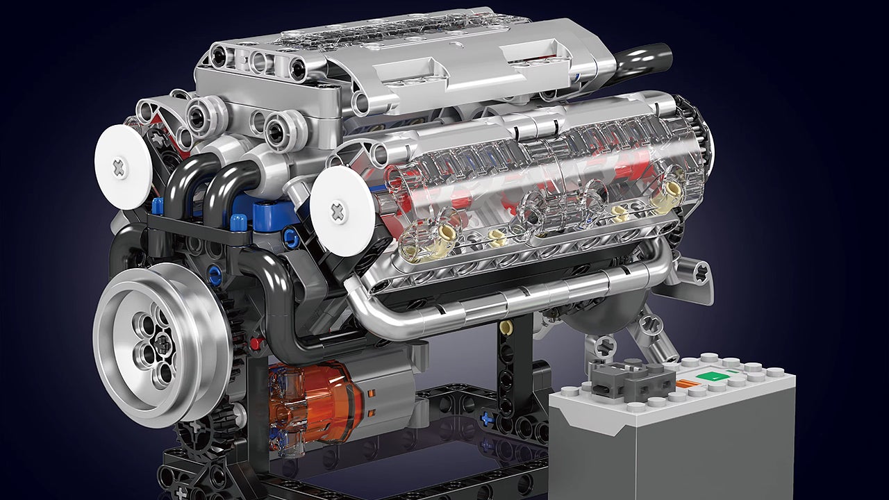 Mould King's best selling set on AliExpress is the 534-piece V8 Engine Assembly 10088, which includes a powered motor and rechargeable battery. This naturally aspirated engine features a transparent cylinder head that showcases the rotating pistons and crankshaft working in tandem, as well as little details like a crankshaft pulley, timing chain, and radiator fan. This isn't a big set, measuring 7.5"x5"x5", but small doesn't mean easy. In fact, it's usually quite the opposite because this is a relatively challenging build that will take a few hours to complete.